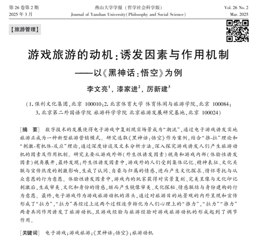 游戏旅游的动机:诱发因素与作用机制——以《黑神话:悟空》为例
